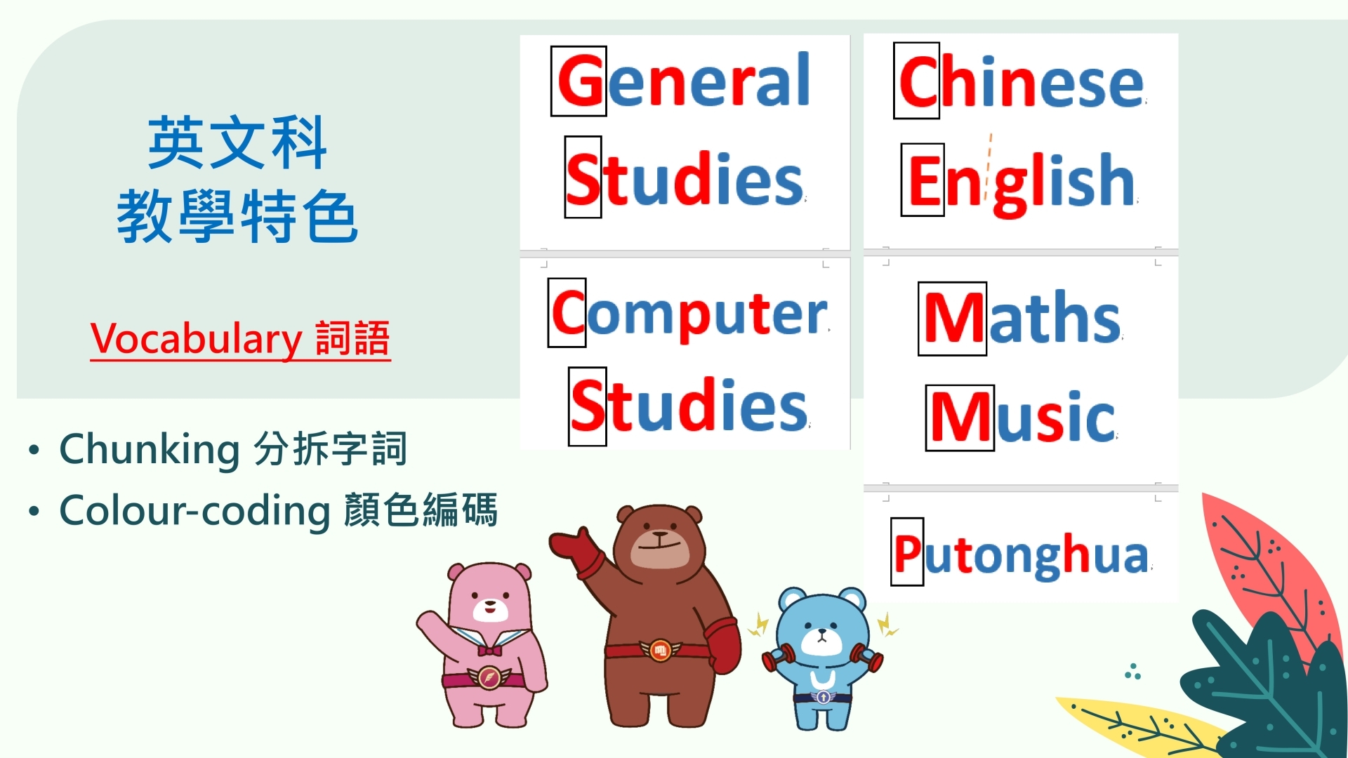- 英文科設銜接課程,複習字母、常見字與課堂用語,並運用顏色編碼與分拆策略輔助識字,另由外籍教師每週兩節教授拼音,強化發音與字詞結構掌握。